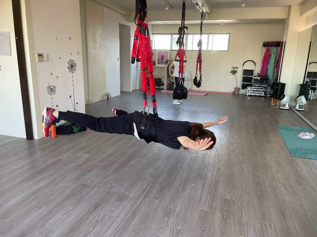 空中のエクササイズは重力から解放されよりご自身の身体を体感出来ます。