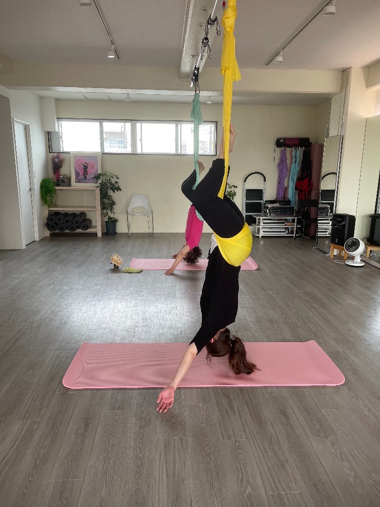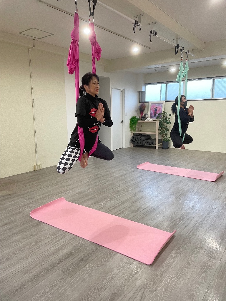 今日は一年ぶりのエアリアルヨガのお客様とお友達の初体験のお客様でした。