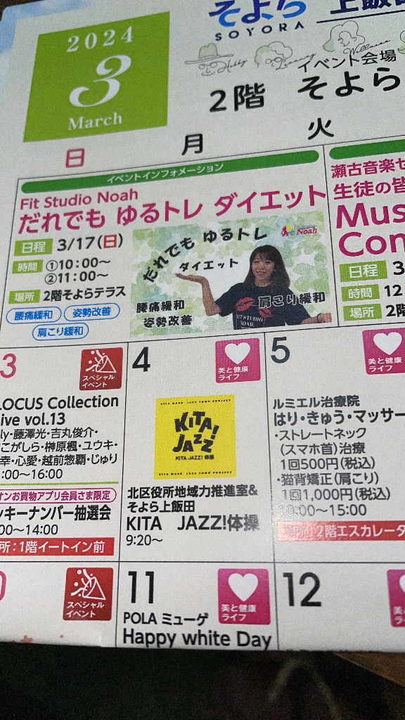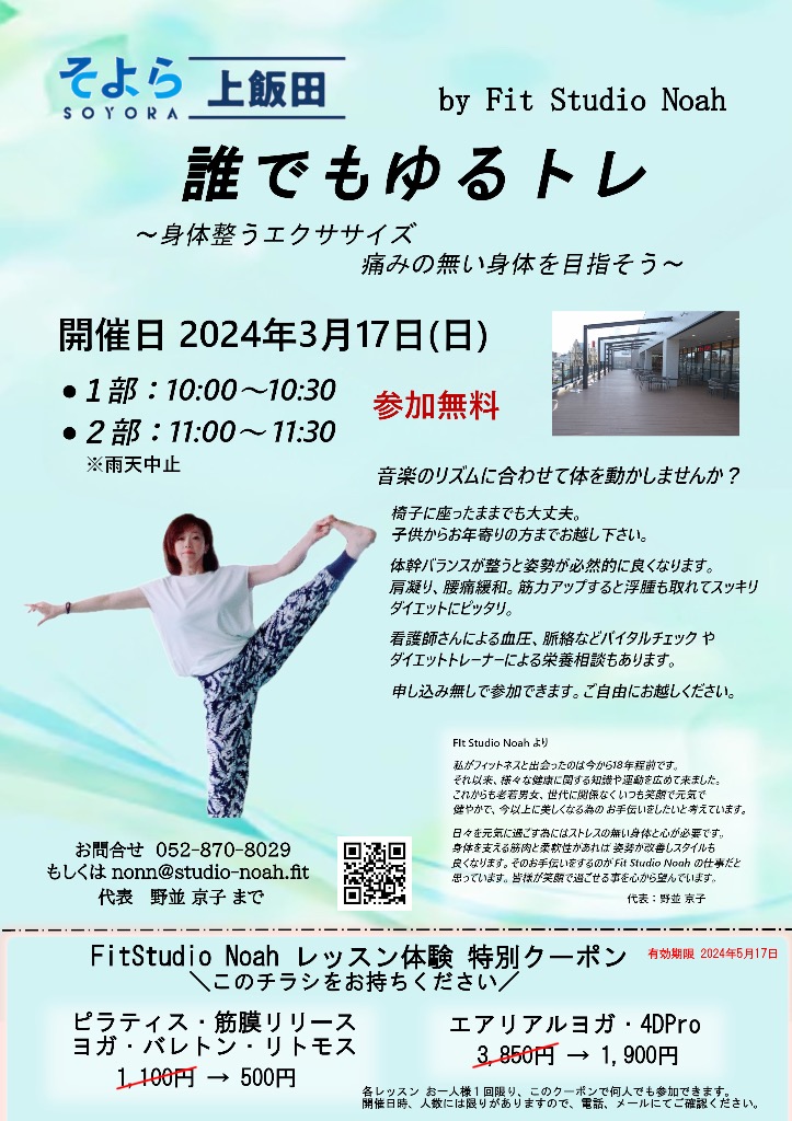 3月17日のそよらさんのイベントもあるし、Noahに興味のあるお客様にNoahでのレッスンを受けて頂きたいです。少人数制ならではのアットホームな雰囲気で身体の調子を整えてダイエットしたい主婦の方や体力増進したい高齢者にちょうど良いクラスを作ります。